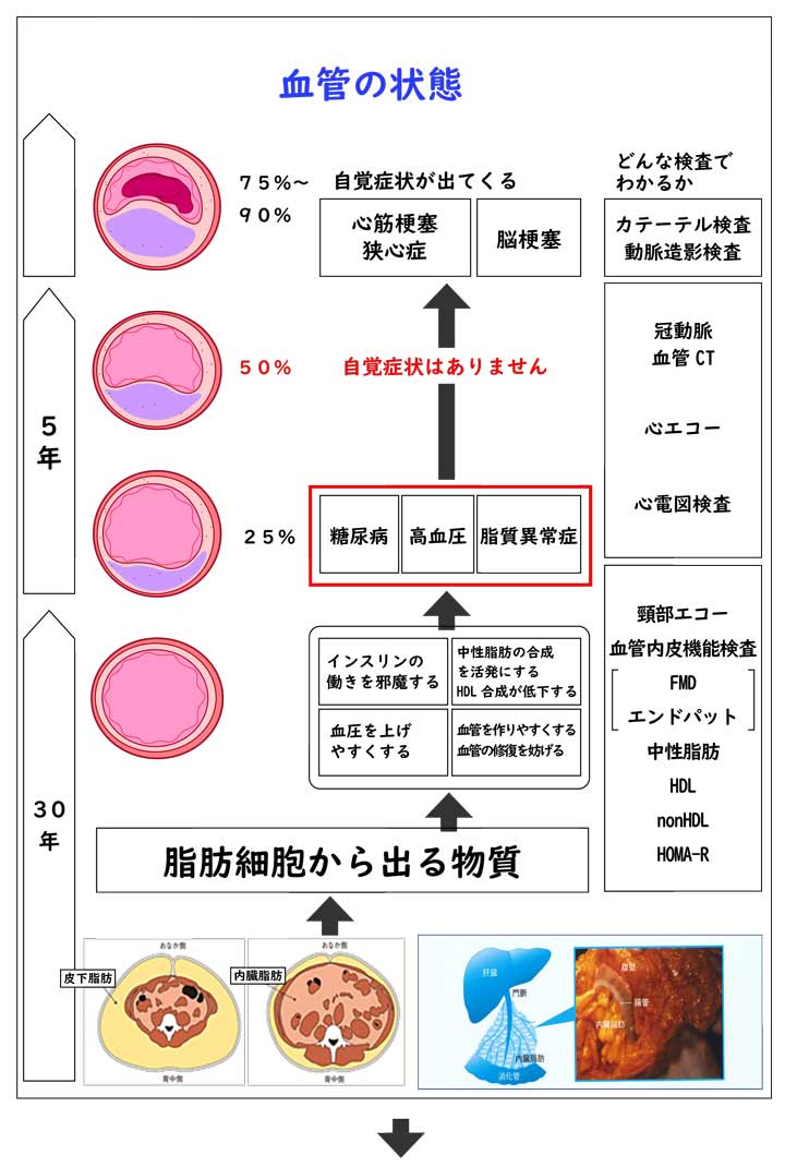 血液検査・尿検査・腹部エコー・血管脈波検査などを行います。